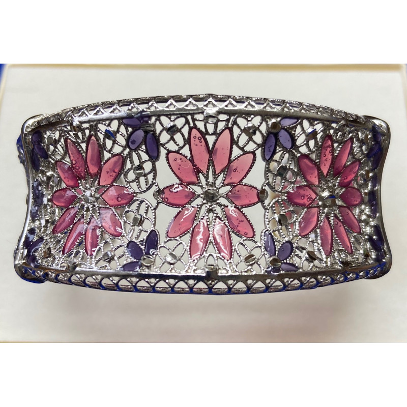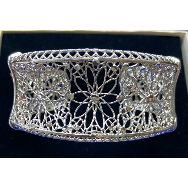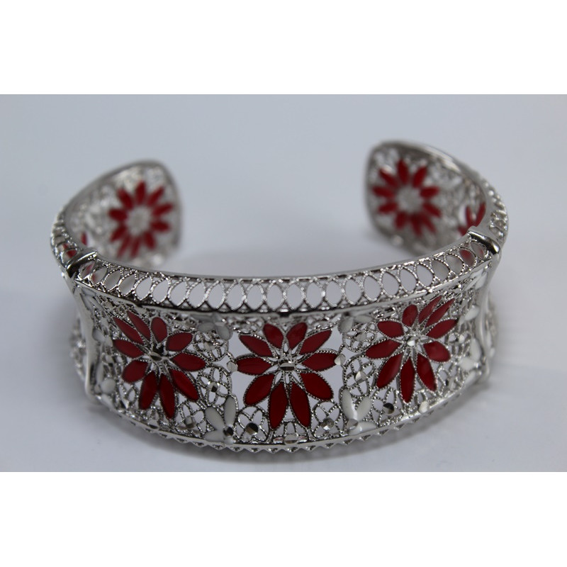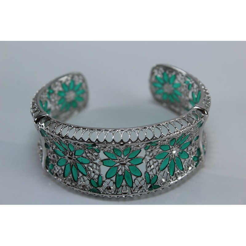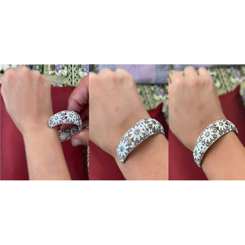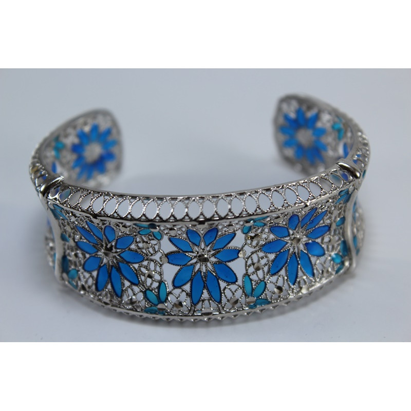 Brazalete en plata de 925mls.Con baño de rodio.Combinados con cerámica vidriada. Decorado con la flor de la vida de la ciudad palatina de Medina Al-Zahra de Córdoba.936.d.c.