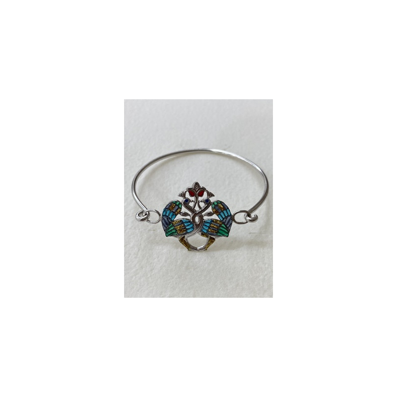 Pulsera en plata de 925 mls. Con baño de rodio. Combinado con cerámica vidriada para metales. Decorado con Pavos Reales de la estancia de la familia real del Califa de la ciudad palatina de Medina Al-Zahra de Córdoba. 936. d.C.