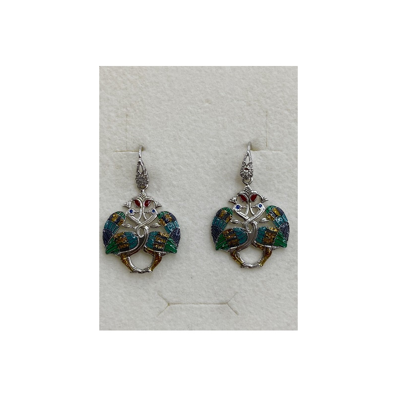Pendientes en plata de 925 mls. Con baño de rodio. Combinado con cerámica vidriada para metales. Decorado con Pavos Reales de la estancia de la familia real del Califa de la ciudad palatina de Medina Al-Zahra de Córdoba. 936. d.C.