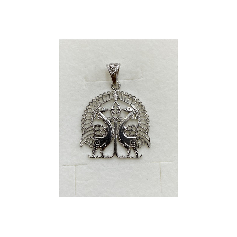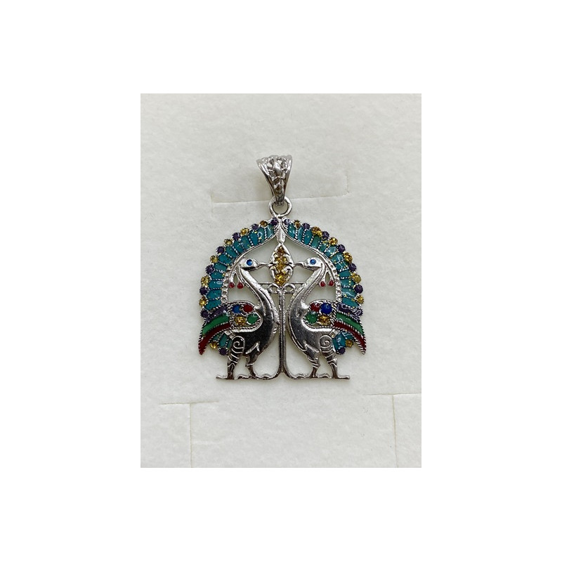 Colgante en plata de 925 mls. Con baño de rodio. Combinado con cerámica vidriada para metales. Decorado con Pavos Reales de la estancia de la familia real del Califa de la ciudad palatina de Medina Al-Zahra de Córdoba. 936. d.C.