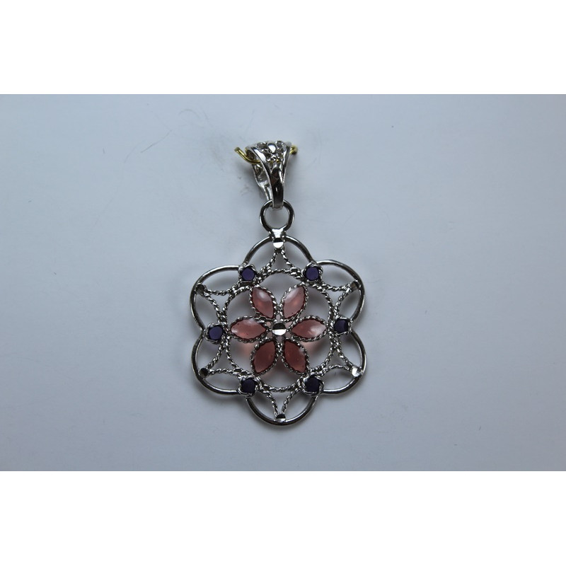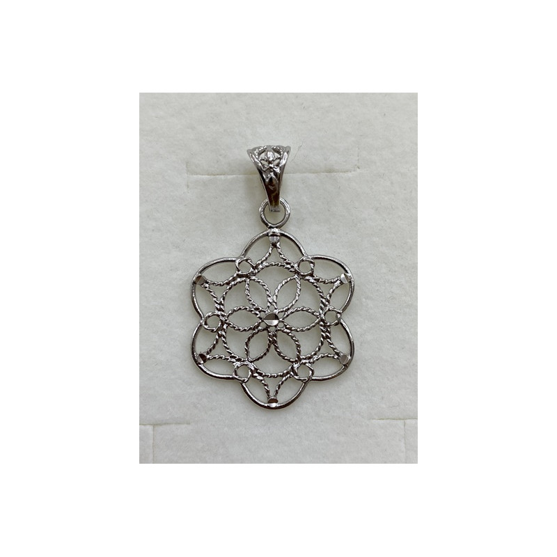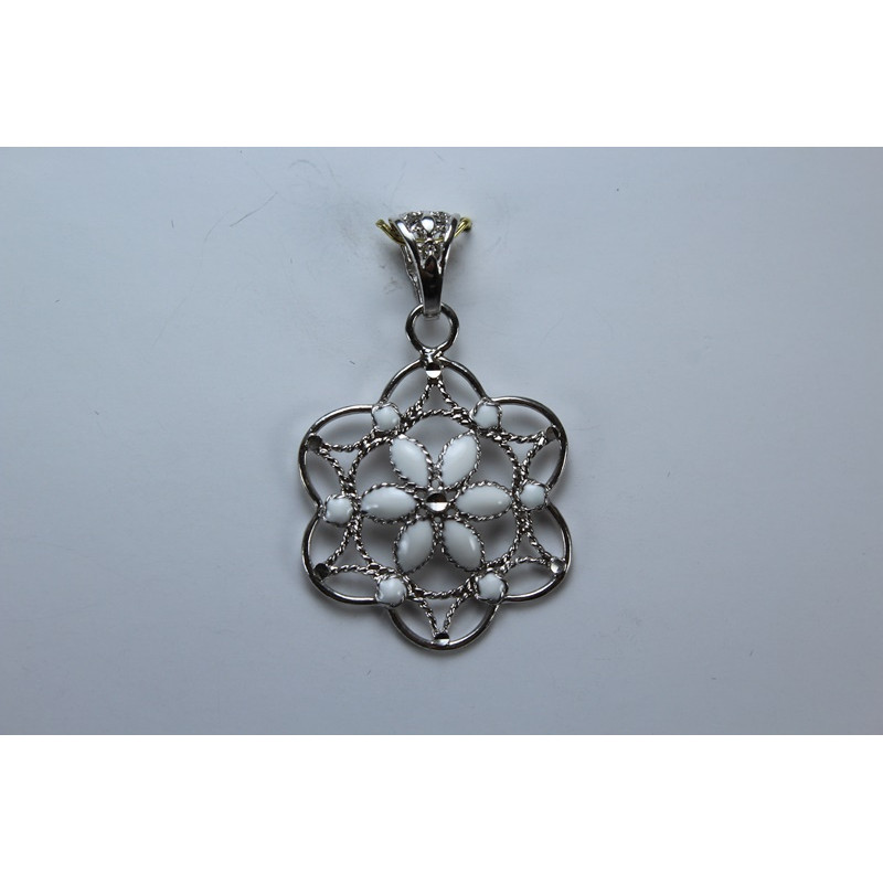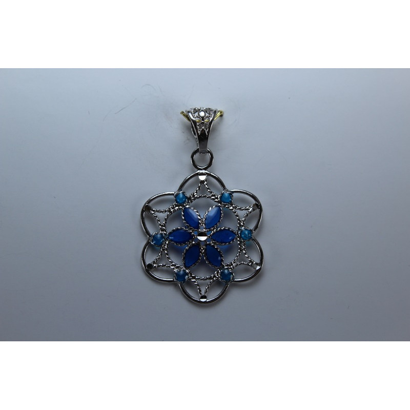 Colgante en plata de 925mls.Con baño de rodio. Combinados con cerámica vidriada para metales. Decorado con la Flor de la Vida combinado con dibujo de Arte Emiral y Califal Andalusí del califato de Abderramán III en 929 d.C.