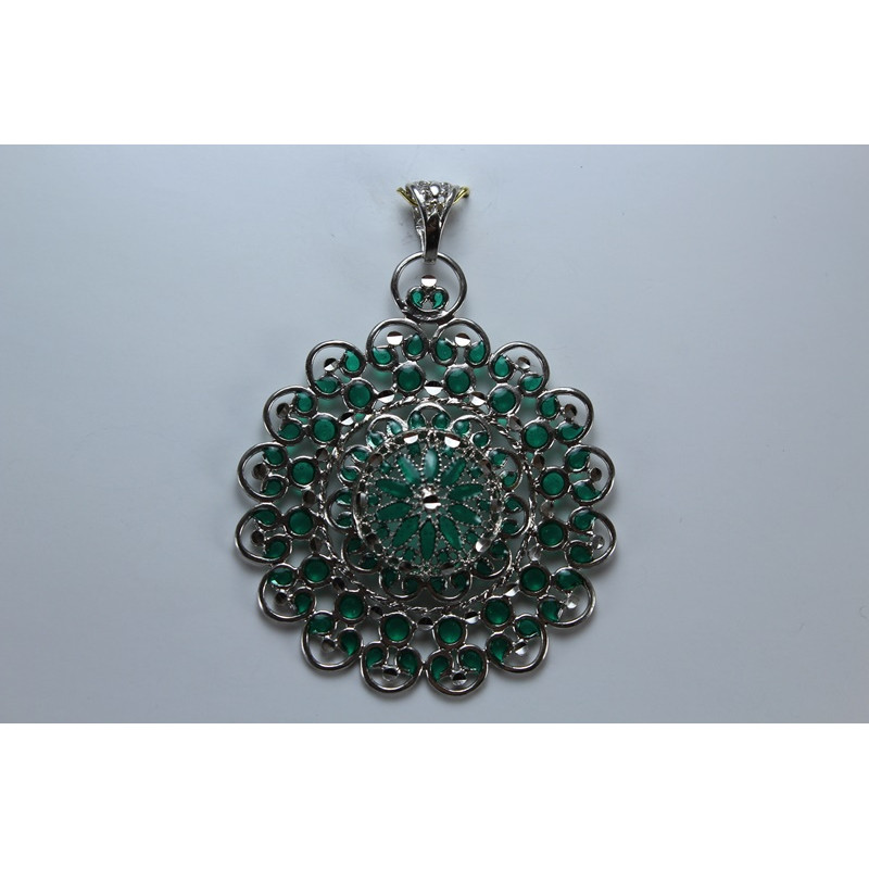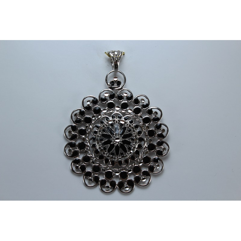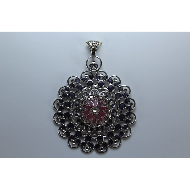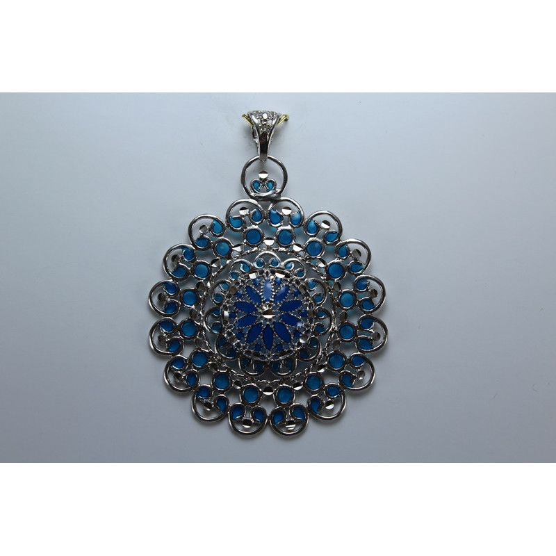 Colgante en plata de 925mls. Con baño de rodio. Combinados con cerámica vidriada para metales. Decorado con la Flor de la Vida combinado con dibujo de Arte Emiral y Califal Andalusí del califato de Abderramán III en 929 d.C.