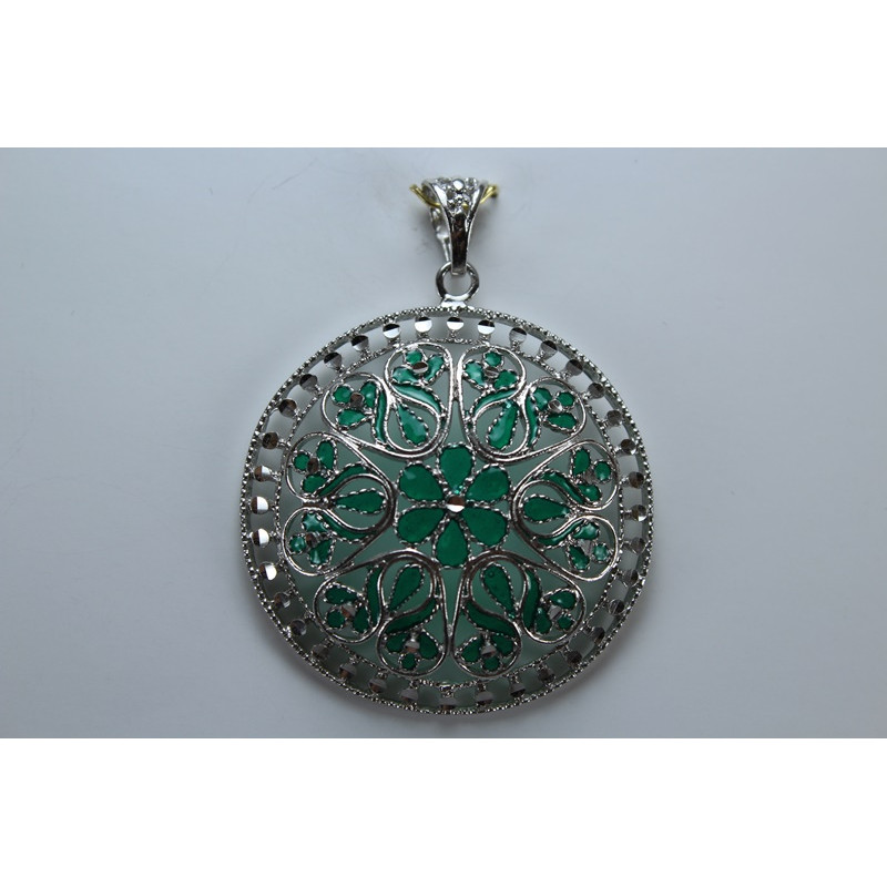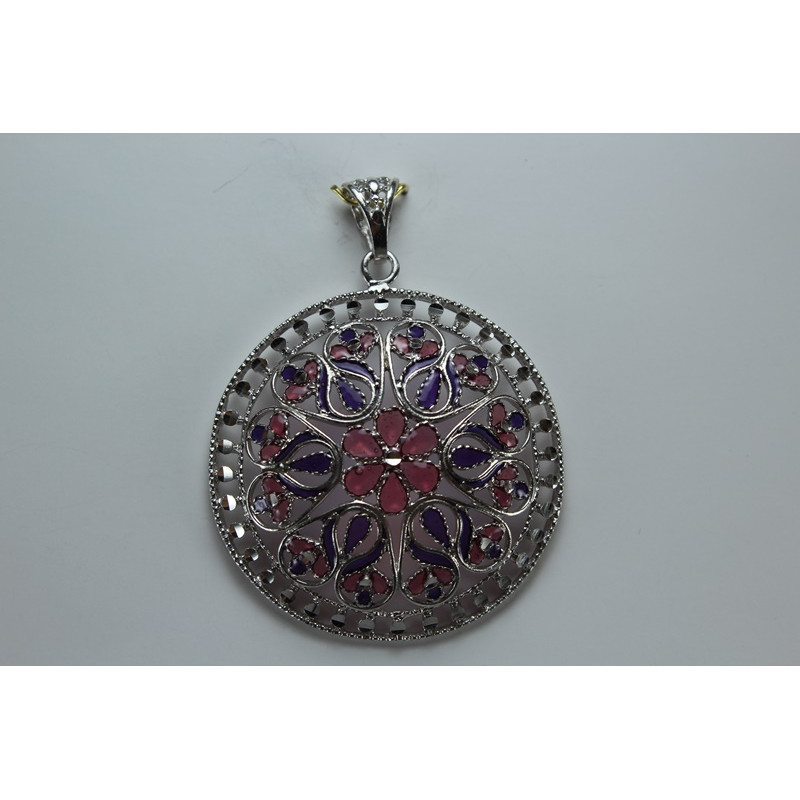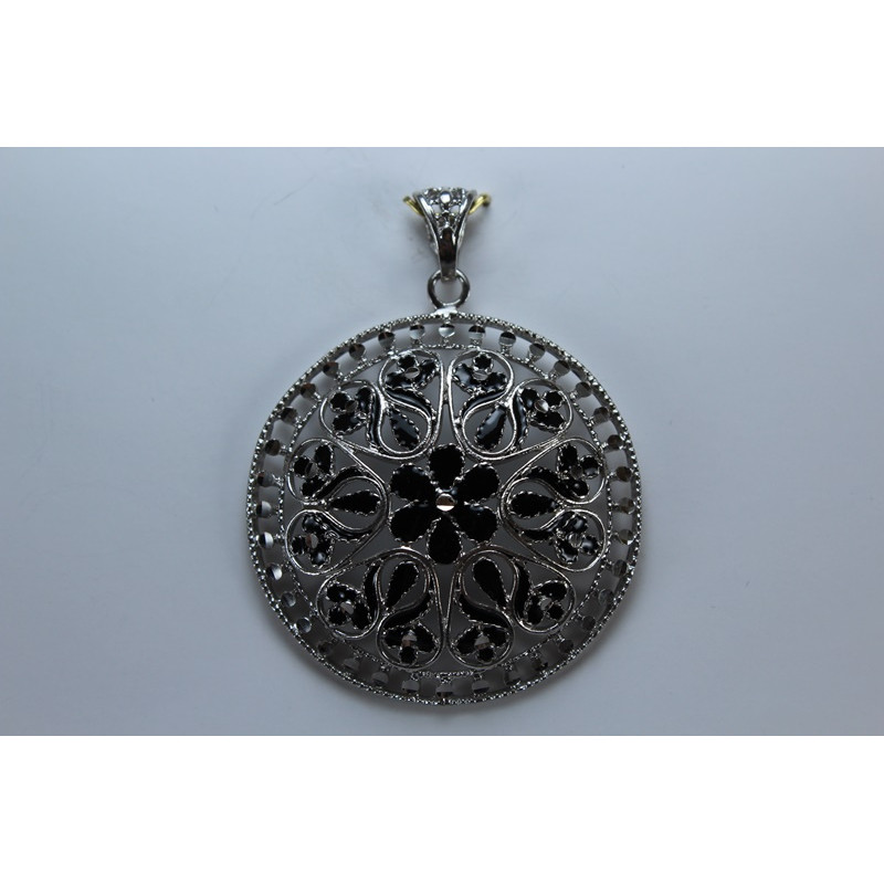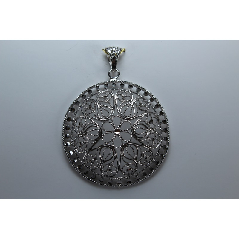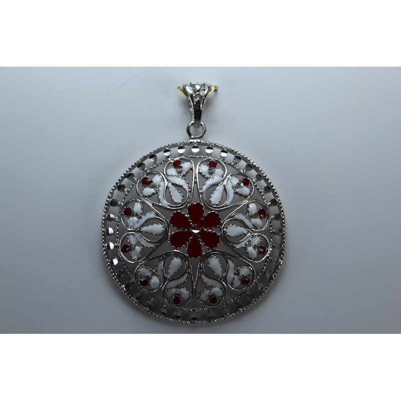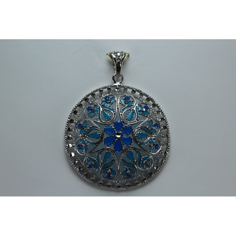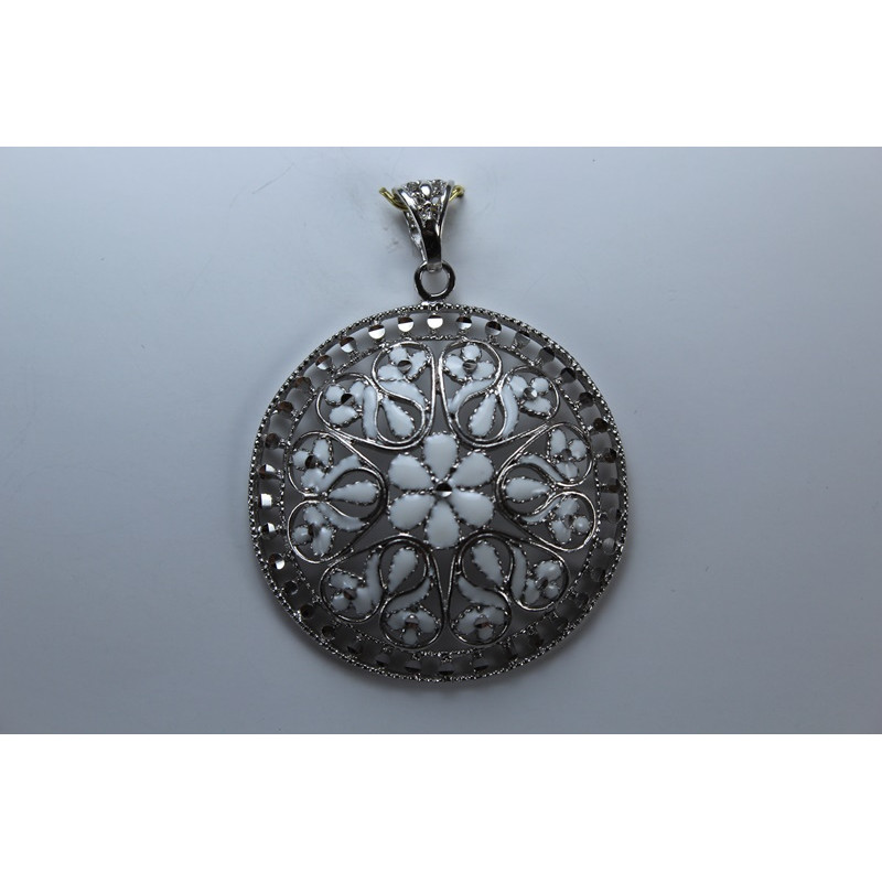 Colgante en plata de 925mls.Con baño de rodio. Combinados con cerámica vidriada para metales. Decorado con la Flor de la Vida combinado con dibujo de Arte Emiral y Califal Andalusí del califato de Abderramán III en 929 d.C.