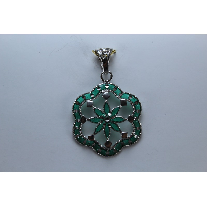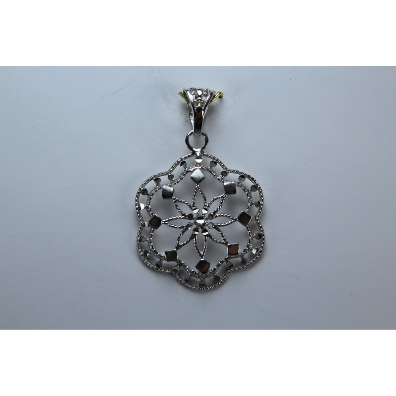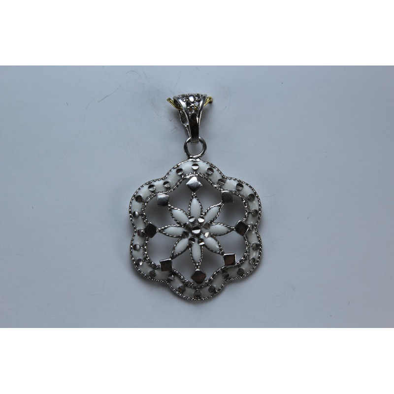 Colgante en plata de 925mls. Con baño de rodio. Combinados con cerámica vidriada para metales. Decorado con la Flor de la Vida combinado con dibujo de Arte Emiral y Califal Andalusí del califato de Abderramán III en 929 d.C.