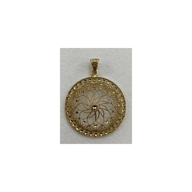 Colgante de plata de 925mls. Con un primer baño de oro blanco y terminación con baño de oro amarillo y combinados con cerámica vidriada para metales. Decorado con el Trono de Dios de la Cúpula de la Maqsura de la Mezquita de Córdoba. 960. d. c.