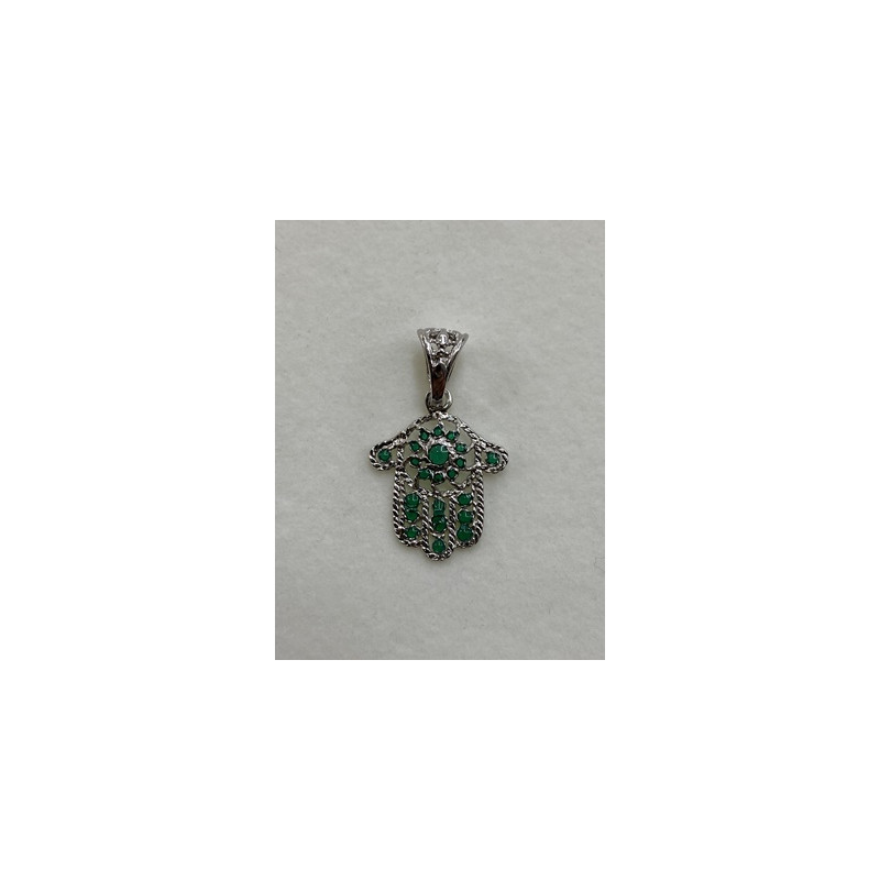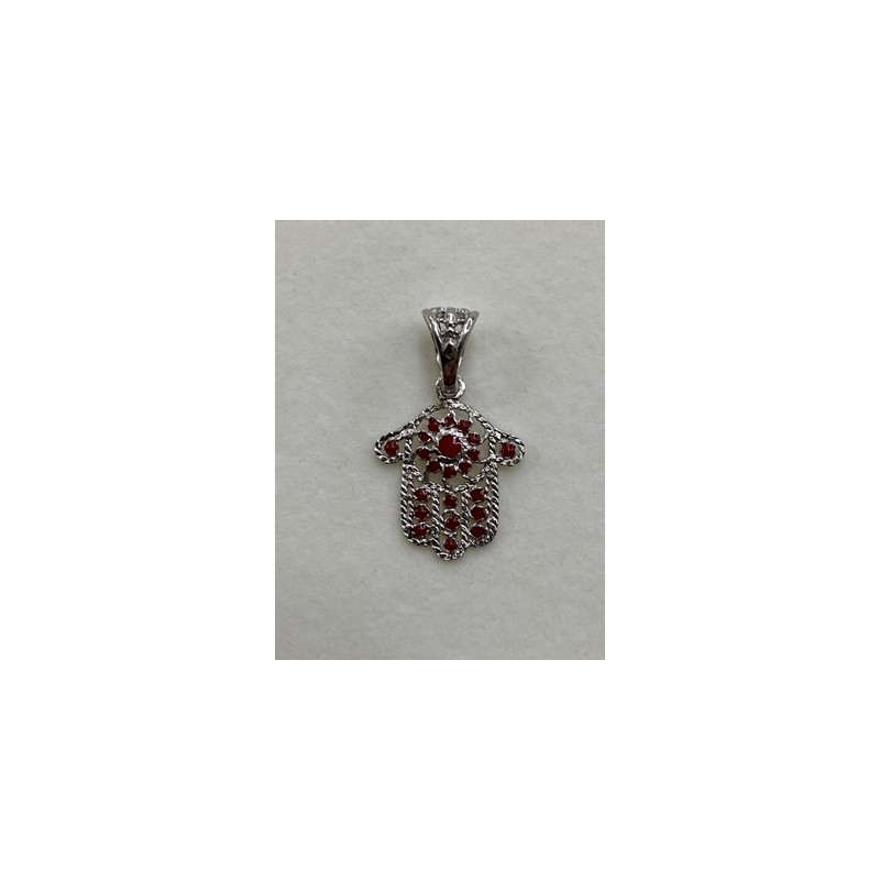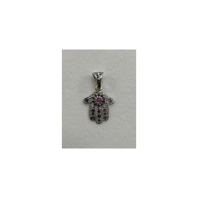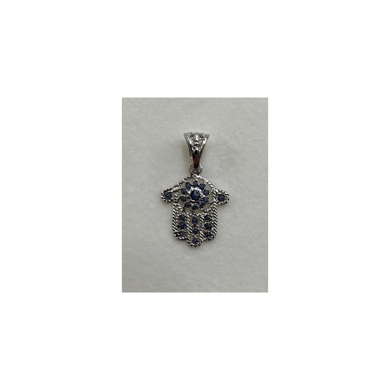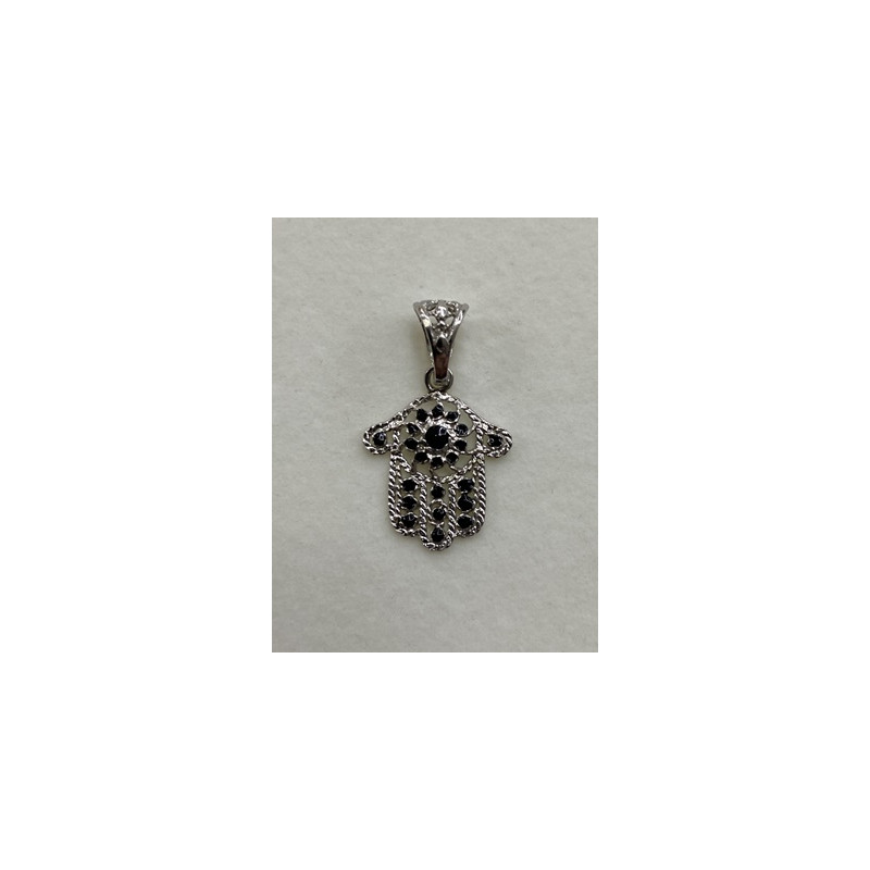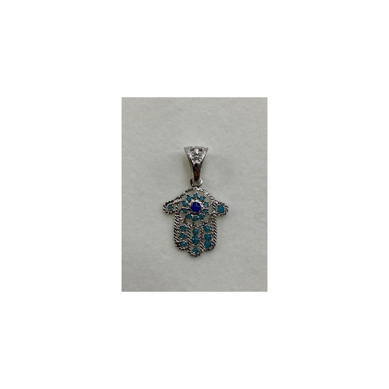 Colgante de plata de 925mls. Con baño de rodio y combinados con cerámica para metales. Diseño de la Mano de Fátima y decorados con dibujo de Arte Emiral y Califal Andalusí del califato de Abderramán III en 929 d.C.