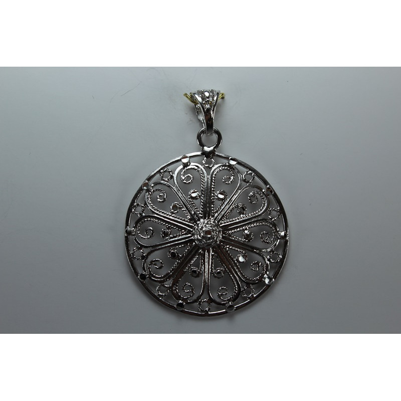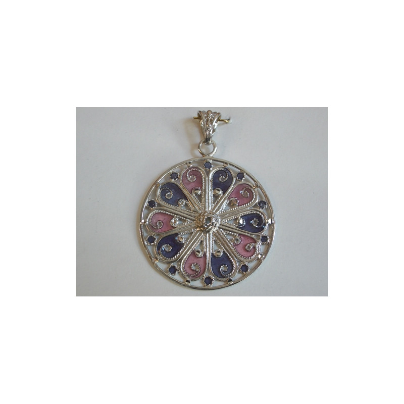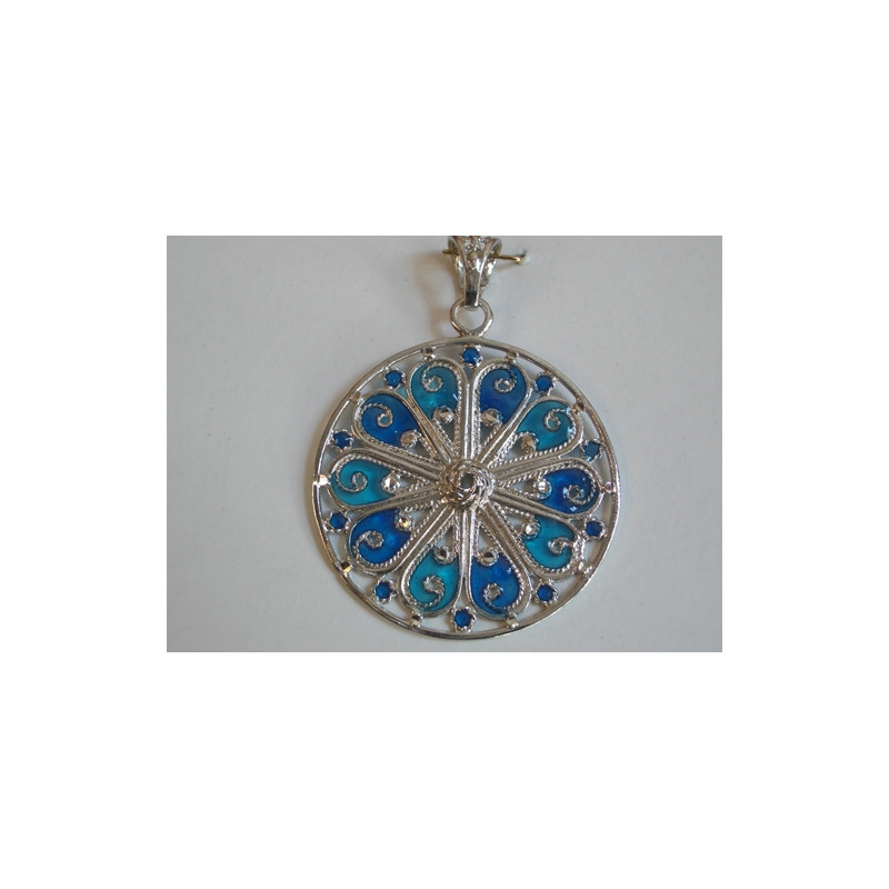 Colgante en plata de 925mls.Con baño de rodio. Combinados con cerámica vidriada para metales. Decorado con dibujo de Arte Emiral y Califal Andalusí del califato de Abderramán III en 929 d.C.