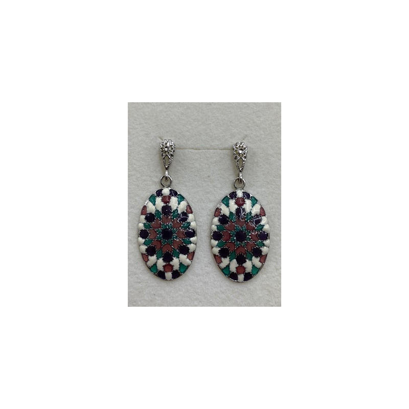 Pendientes en plata de 925 mls. Con baño de rodio y combinados con cerámica vidriada para metales de diferentes colores. Decorado con Azulejo del taller de la ciudad palatina de Medina Al-Zahra de Córdoba del año 936.d.c.