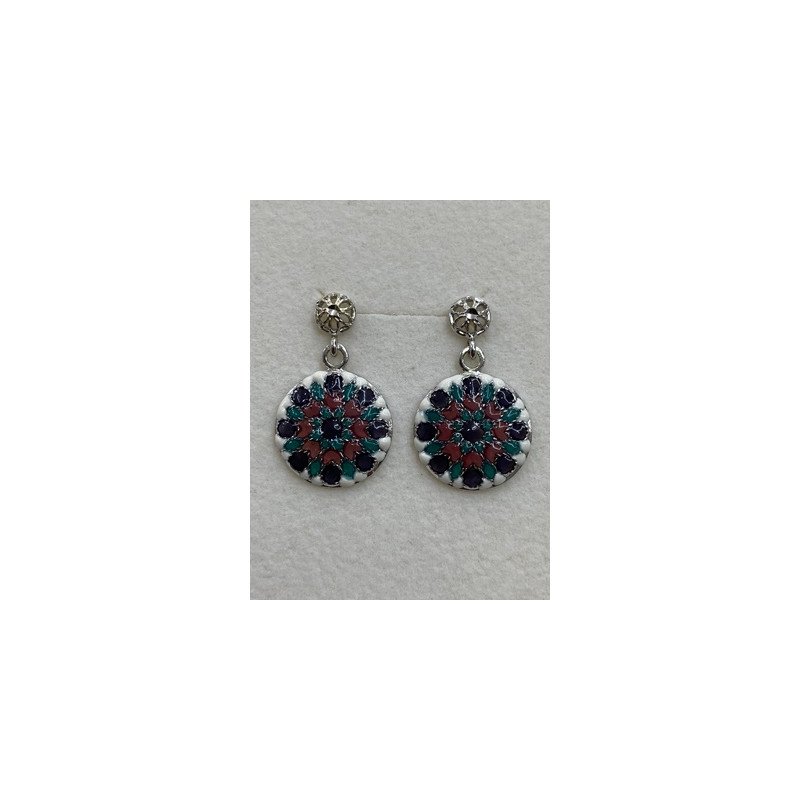 Pendientes en plata de 925 mls. Con baño de rodio y combinados con cerámica vidriada para metales de diferentes colores. Decorado con Azulejo del taller de la ciudad palatina de Medina Al-Zahra de Córdoba del año 936.d.c.