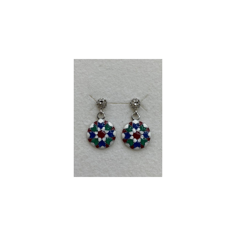 Pendientes en plata de 925 mls. Con baño de rodio y combinados con cerámica vidriada para metales de diferentes colores. Decorado con Azulejo del taller de la ciudad palatina de Medina Al-Zahra de Córdoba del año 936.d.c.