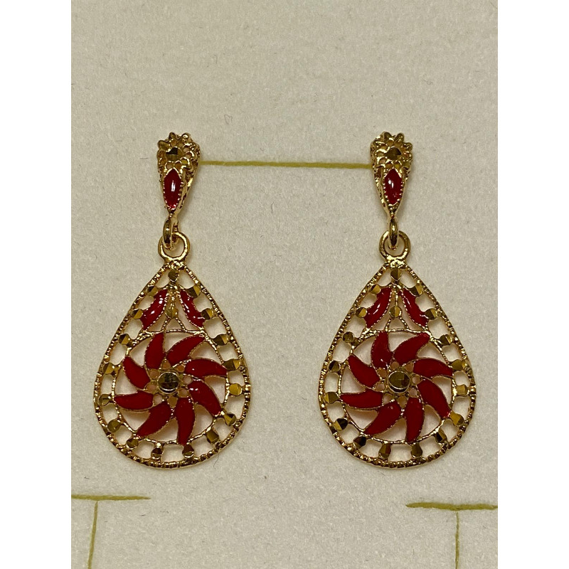 Pendientes en plata de 925mls. Con un primer baño de oro blanco y terminación con baño de oro amarillo y combinados con cerámica vidriada para metales. Decorados con el Trono de Dios de la Cúpula de la Maqsura de la Mezquita de Córdoba. 960. d. c.