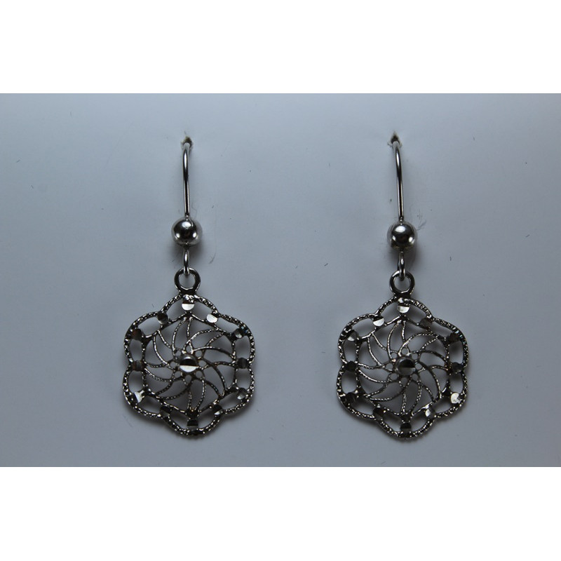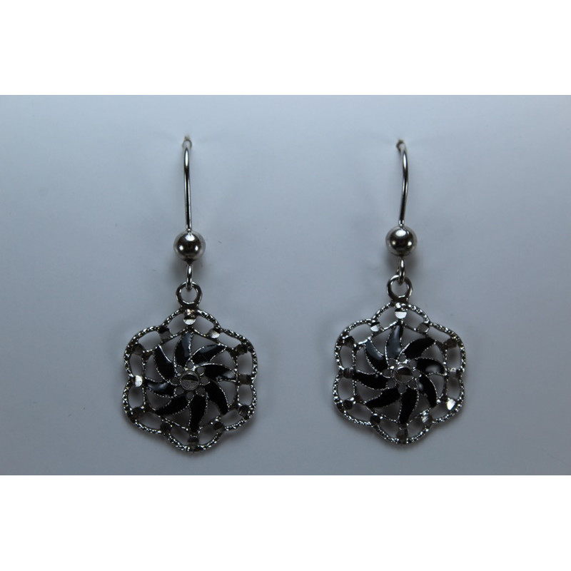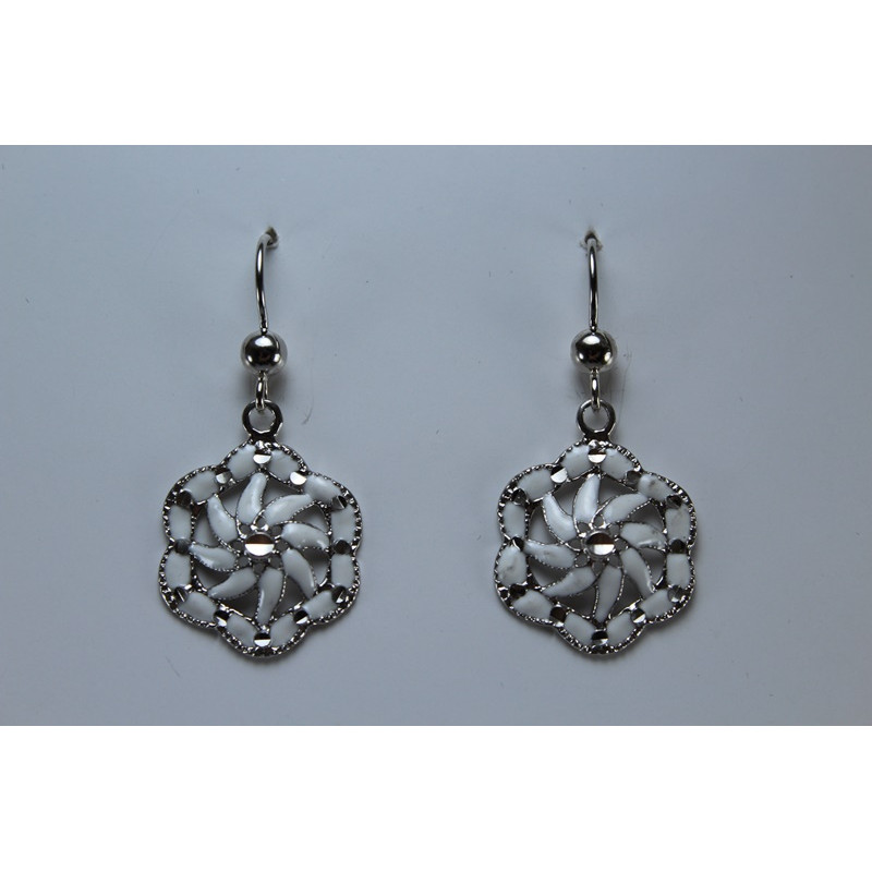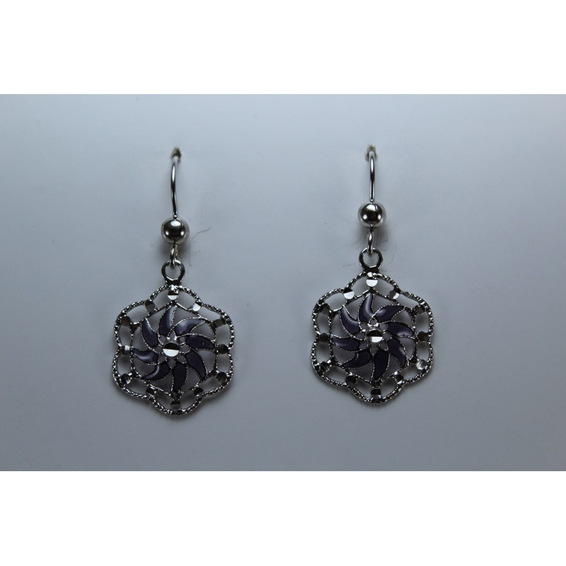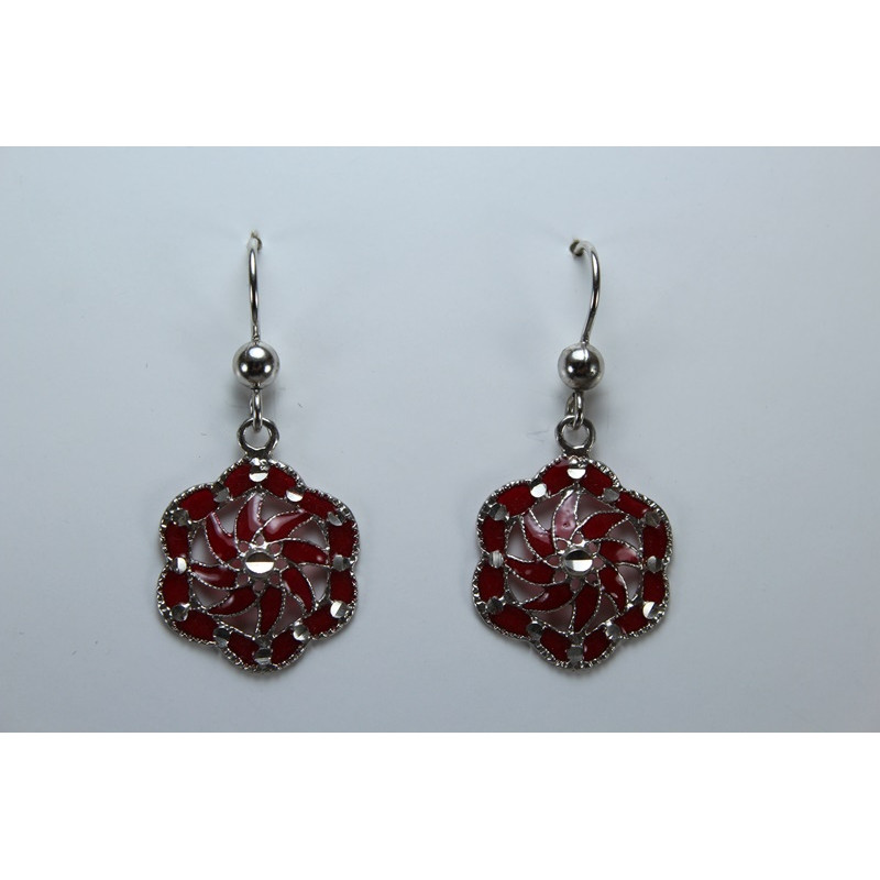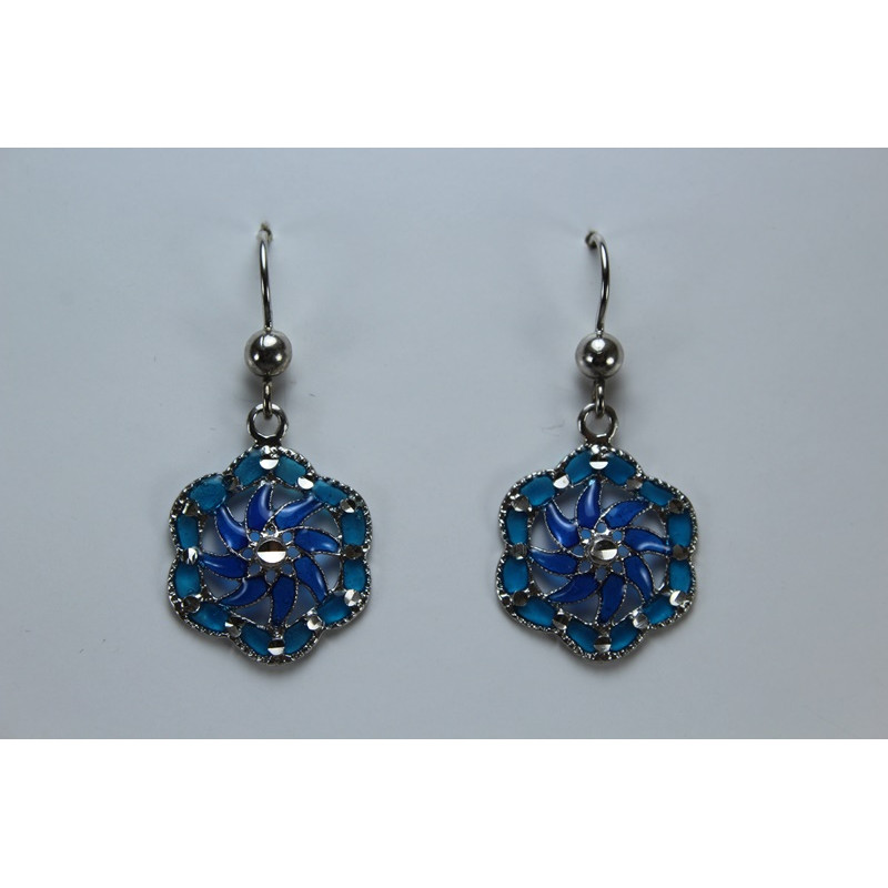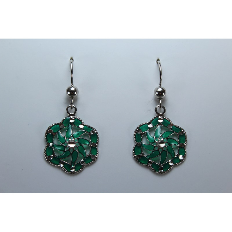 Pendientes en plata de 925 mls. Con baño de rodio. Combinados con cerámica vidriada para metales. Decorado con el Trono de Dios de la Cúpula de la Maqsura de la Mezquita de Córdoba. 960. d. c.