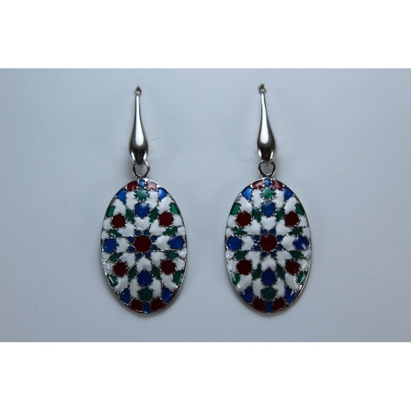 Pendientes en plata de 925 mls. Con baño de rodio y combinados con cerámica vidriada para metales de diferentes colores. Decorado con Azulejo del taller de la ciudad palatina de Medina Al-Zahra de Córdoba del año 936.d.c.